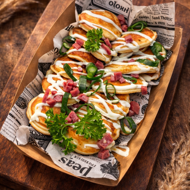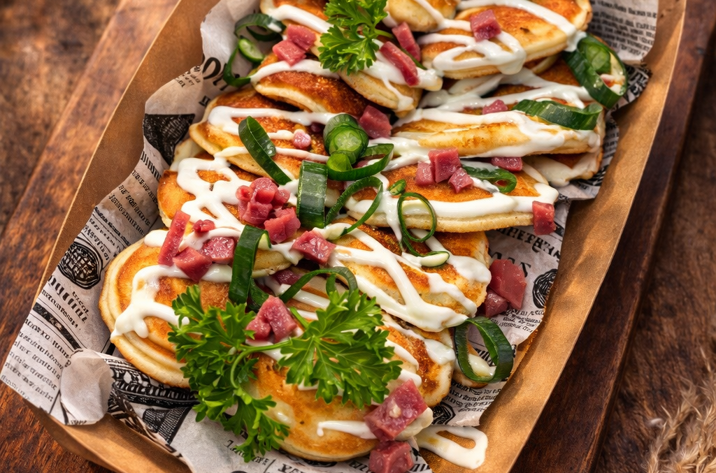 Fluffige Mini Pancakes mit herzhaften Toppings. Perfekt als Snack, Hauptspeise oder Mitternachtssnack.